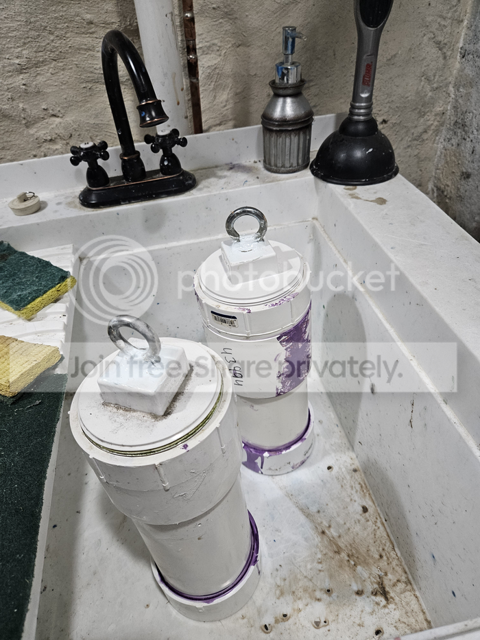 So now the two weights are sitting in the slop sink to drain more, and I'm also waiting for the glue and the caulk to dry.