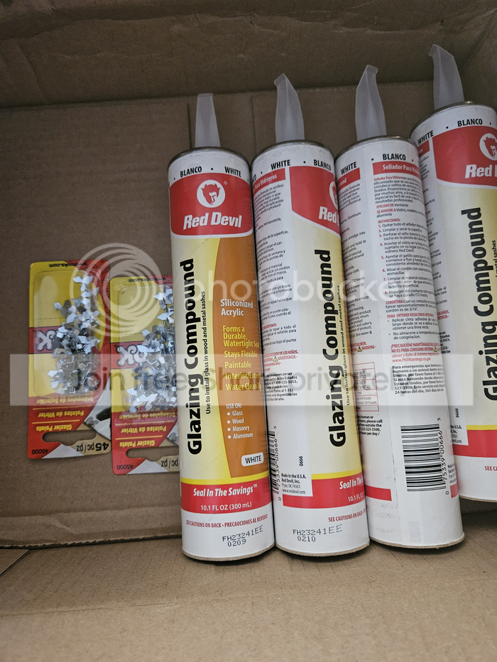 The glazing compound also came today, along with points... small metal tabs used to hold glass panes in place.