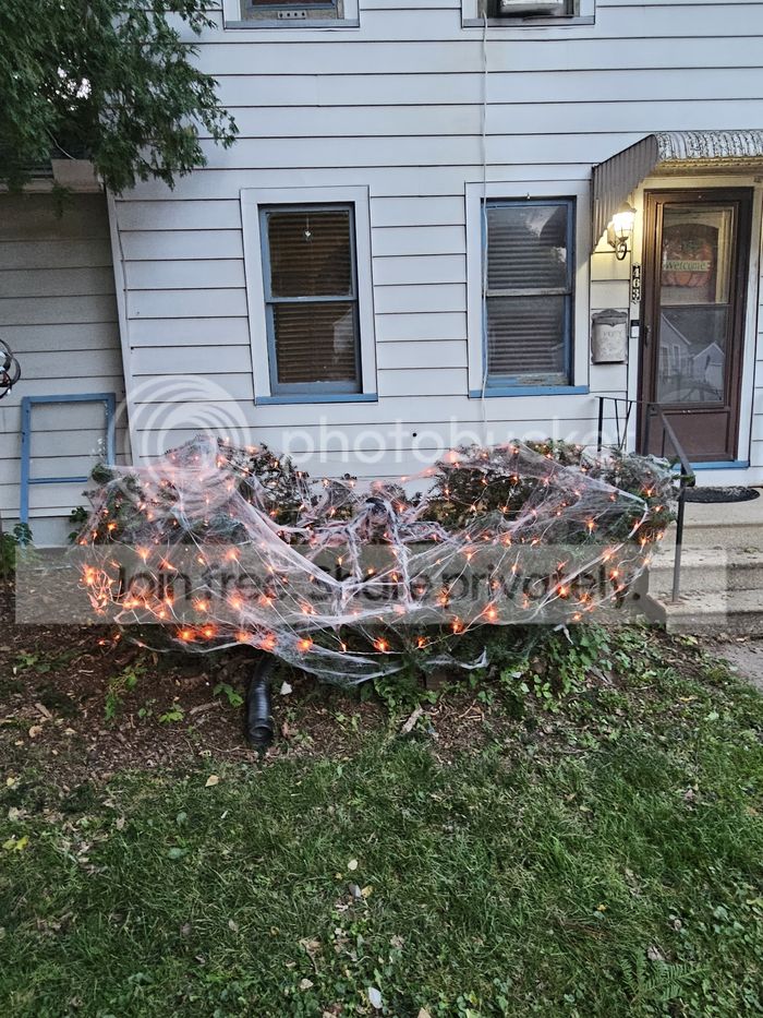 Front bushes, as freshly pruned, with lights, webbing, and a giant spider that you can barely see, because he blends in too much with the webbing.