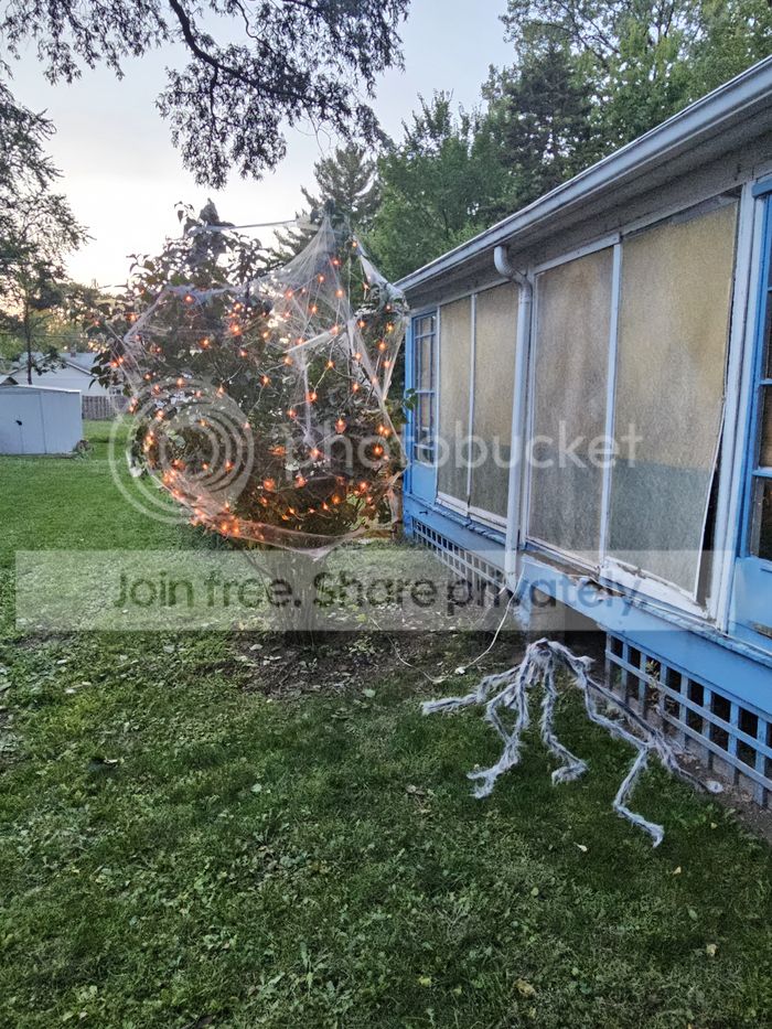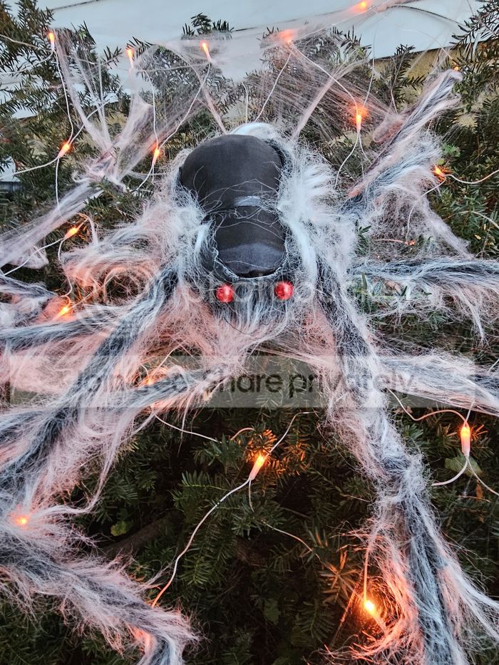 Webbing and lights on the lilac bush, with a second giant spider nearby.