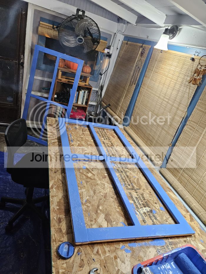 So I unboxed those to have a quick look at them, but then went out to the porch to use the last of my epoxy wood putty on the seams of the fronts of the two storm frames. And those patches are now drying.