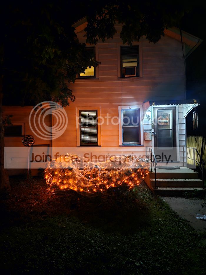 I used to do webbing on my front bushes back when I lived on Illinois Avenue, but this is the first time I've ever put out lights for Halloween.