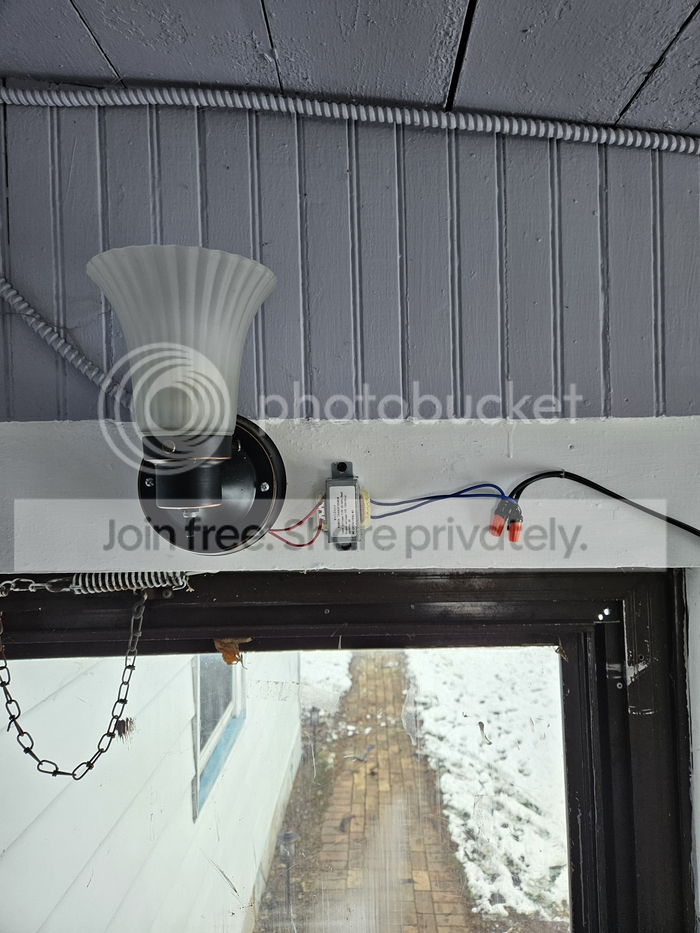But anyway, here's my 12V transformer wired into the junction box of the light over the door, which in turn is wired up to the photo sensor on the outside.