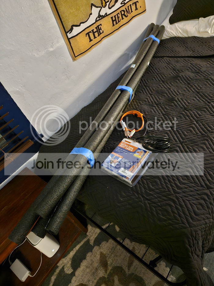 But this was a goddam emergency, so I went for it!.. two six-foot pipe heating wires, and four six-foot tubes of foam pipe insulation... for a grand total of $113.00... on the Home Depot card.