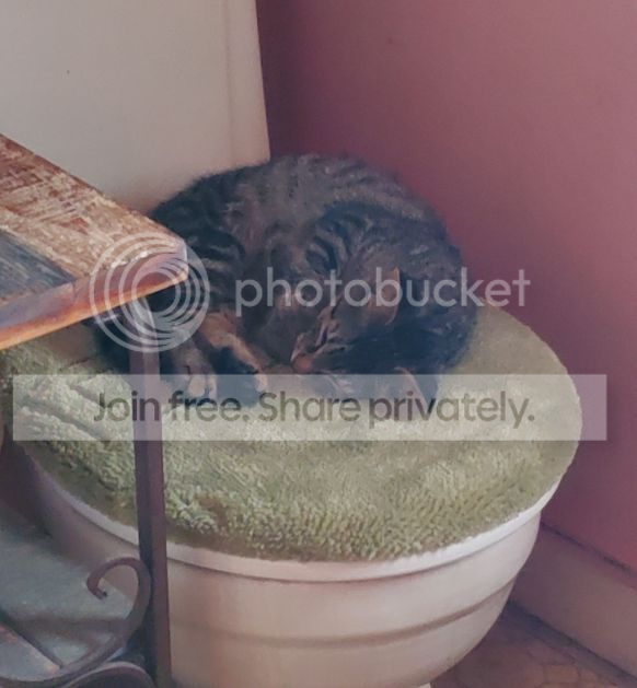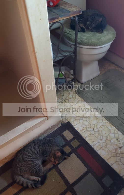 They ate and drank for a good while, and Snoop used the litter box, but prowly didn't seem to have to go yet. Both of them went into my bathroom, which was right there... curled up, and went to sleep.