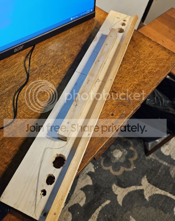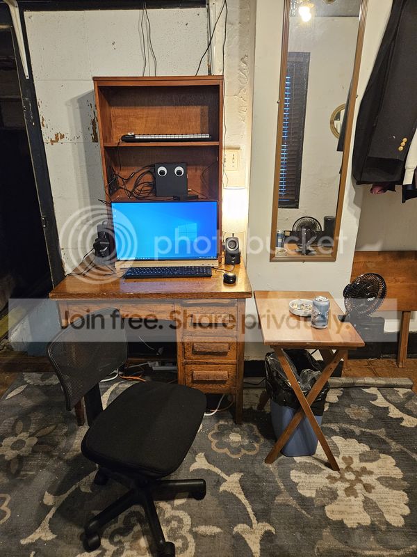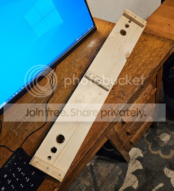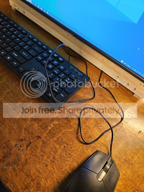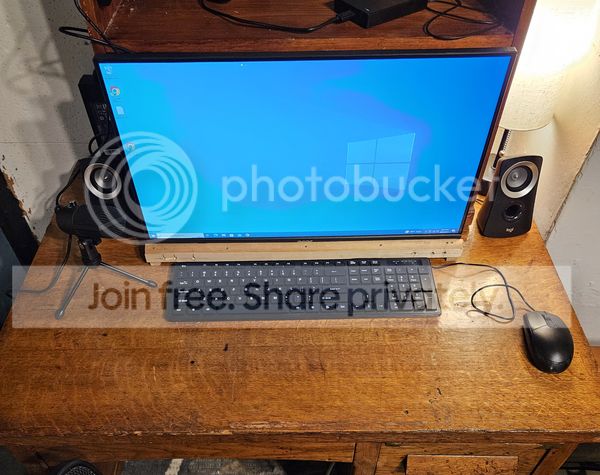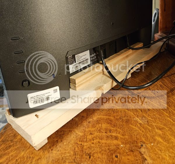 I spent a while last night, down in the shop, creating a custom stand for the new monitor, in order to conserve desk space, and keep it down low... out of the way of Computey!