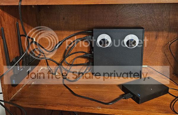 The new backup drive is hooked up here, but it's easy, with the machine on this shelf, to disconnect it and plug in thumb drives and whatnot.