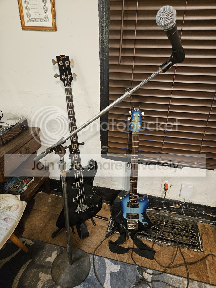 The two guitars on their new stands, and my new stage mike on a very old boom stand I've had and used since the late 1980s.