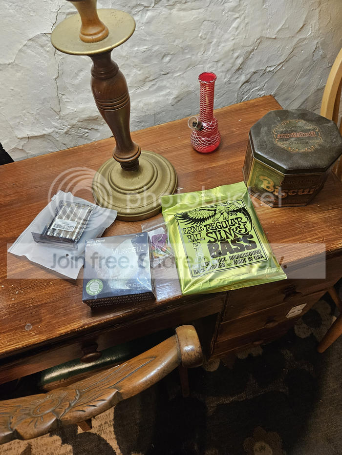 Left to right; plug ends and wire for the rotary phone mike, a 3-pack of electric guitar strings, a bag full of Dunlop fishfin guitar pics, Earnie Ball bass guitar strings, my bong from Fiesta Food Mard, and the tin where I keep my weed.