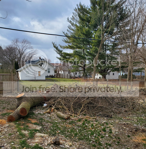 Behold the fallen mulberry! In the upper left where chainlink meets wood fence is the south property line, and we are facing west. My yard is on the right.