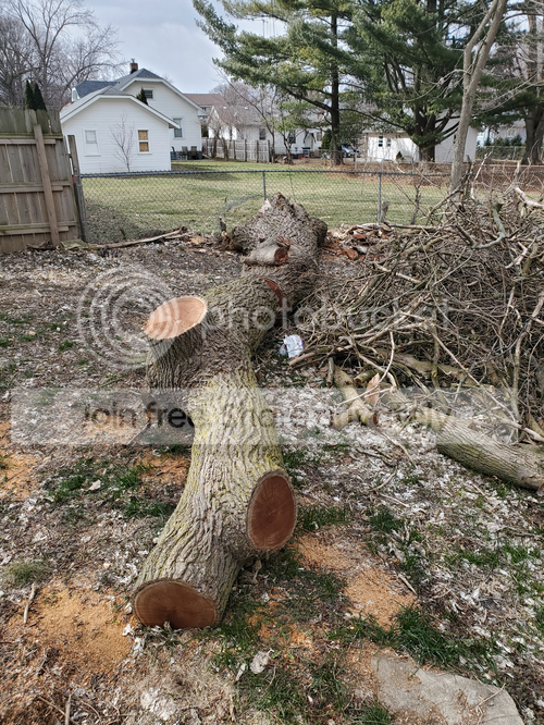 All those branches on the right are what I had to throw over from my neighbors yard in haste, late last October, after the vertical limb, that top cut on the trunk, rotated down into their yard.