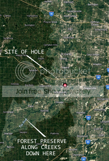 In the above pic, the western boundary of the Chicago metro is highlighted, including areas that are either forested, paved, or both. And What we see in the lower left is that there's a network of large creeks well to the west of Aurora, that are heavily forested along their banks.