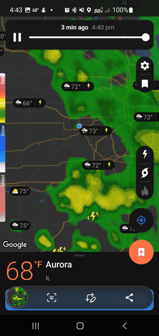 You can also see lightning strikes getting registered around the northwest edge of town, just as the storm system starts to weaken, and the hole opens to the southwest.