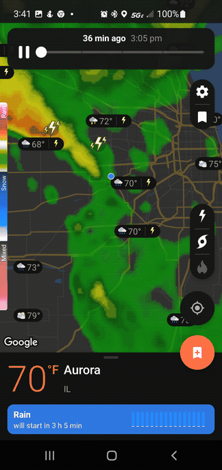 As you can see, a very active system with a large yellow and red core is bearing down on Aurora from the northwest. It is heading straight for town. But as it attempts to pass over, three things happen...