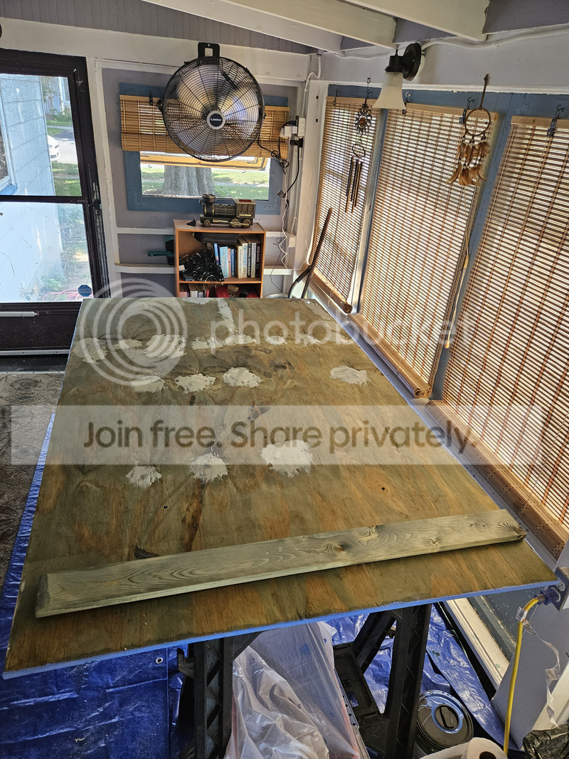 I flipped the plywood over and gave the underside a final coat of preservative, to replace whatever got sanded off around the edges of the epoxy patches.